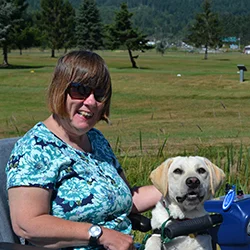 Lacey, a Stanwood, WA, resident, has Limb Girdle Muscular Dystrophy Type 2I and Relapsing Polychondritis, which affects her limbs, lungs and heart. She relies on a walker and an electric wheelchair for mobility, can’t bend over to pick things up, and can’t get up if she falls. She says Isabelle has enhanced her life in so many ways with daily tasks but also with wonderful companionship. “It is such a gift to have Isabelle. She is right by my side and knows when to put her head on my lap, smile and give me a kiss letting me know it's all going to be okay.”