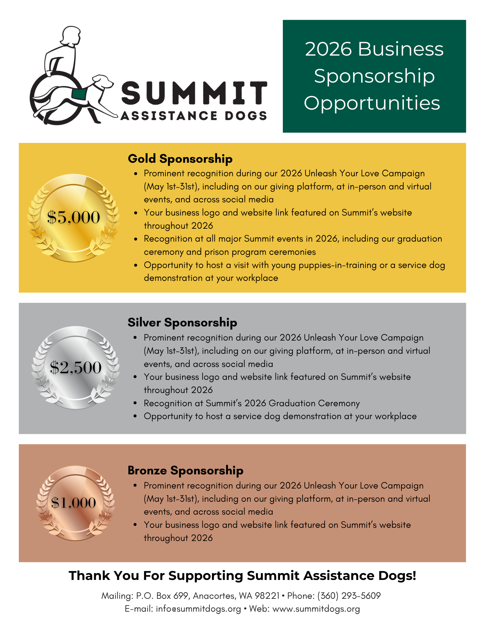 Summit Assistance Dogs is grateful to the following corporate sponsors, foundations, and organizations that support our mission.