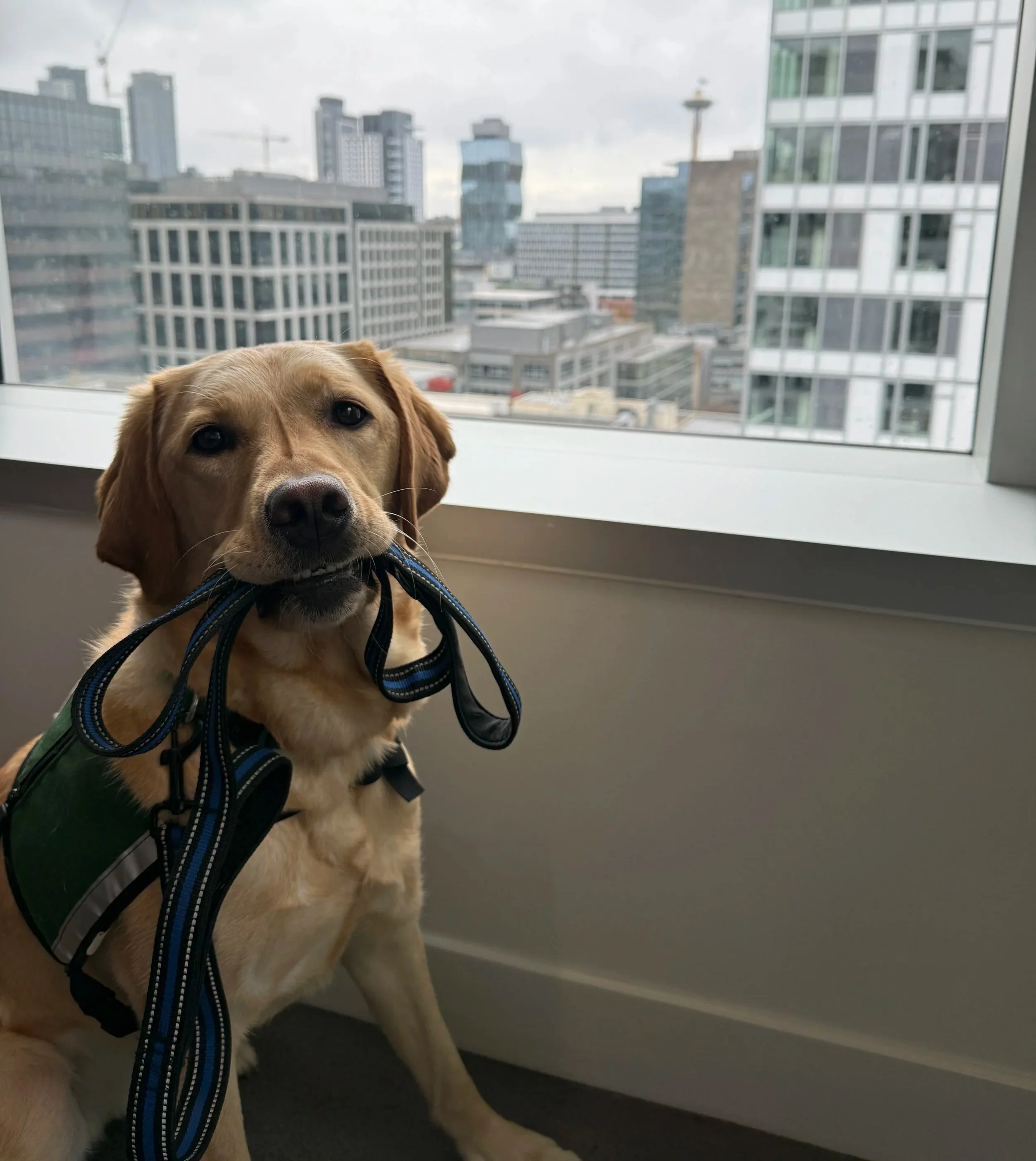 Sandy is an energetic and playful Labrador–Golden mix who brings both enthusiasm and focus to her work. She’s a highly motivated partner who loves to please and thrives on praise, food rewards, and engaging training. Sandy is skilled in tasks such as retrieving items, tugging off clothing, tugging open and closed doors, and activating buttons. She enjoys working out in public as much as relaxing at home. While she settles nicely, she’s always ready to jump into action—her upbeat “what are we doing today?” attitude makes her a wonderful match for someone who leads an active lifestyle and enjoys working with their dog. Sandy has a faster walking pace and would do well with a wheelchair user.
